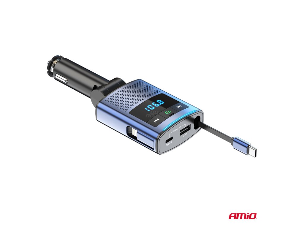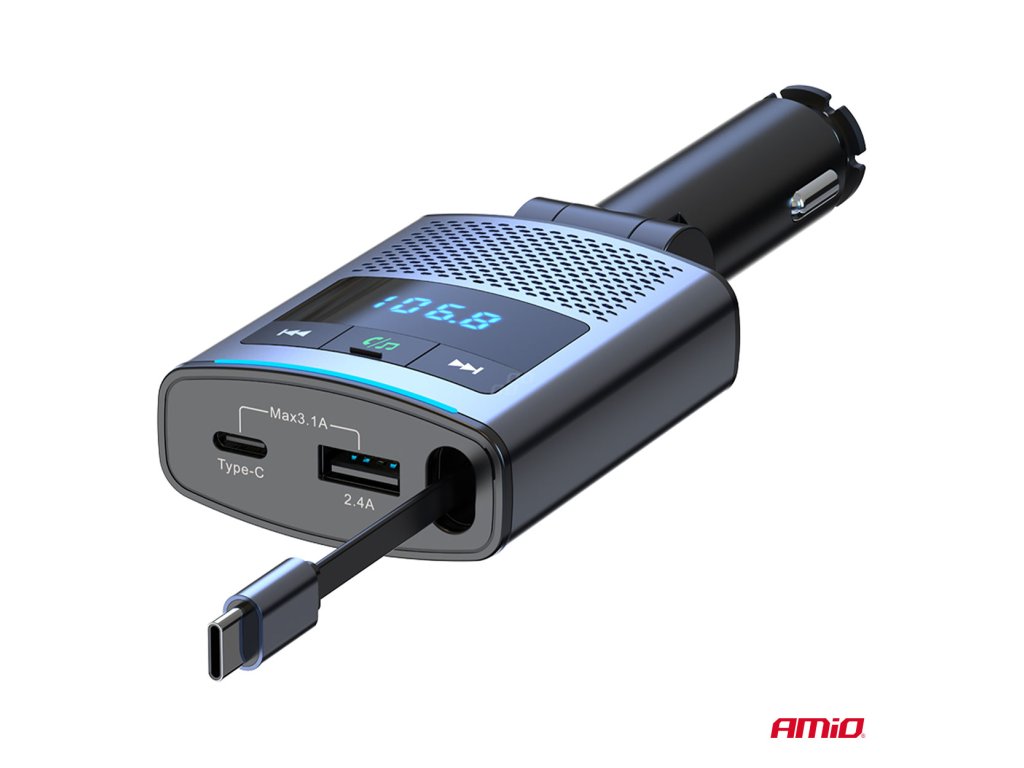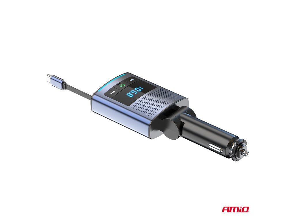 Multifunkčný FM transmitér s Bluetooth modulom a vstavaným, vysúvacom USB-C káblom, ktorý uľahčuje nabíjanie zariadení bez potreby používania ďalších vodičov. Umožňuje prehrávanie hudby a vedenie telefonických hovorov v režime hands-free.