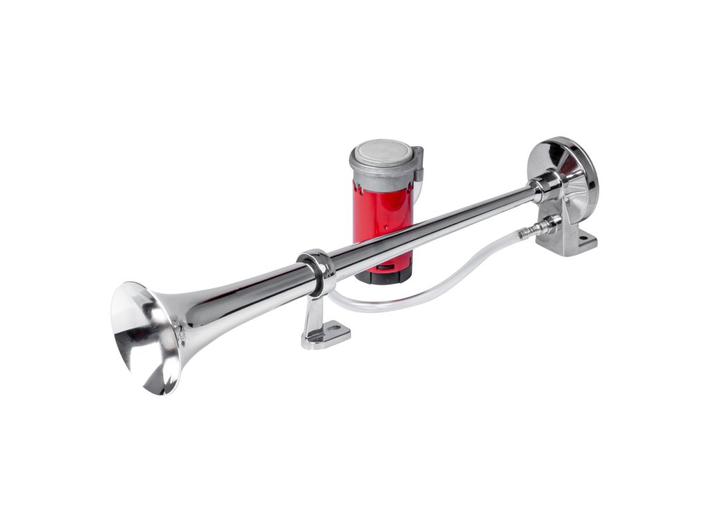 Kvalitná, profesionálna, chrómovaná, pneumatická fanfára s kompresorom v súprave, prispôsobená pre 12V inštalácie.
