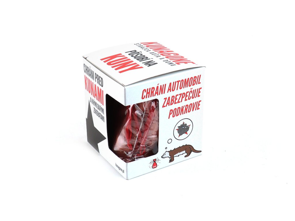 Odpudzovač kún KUNAGONE - balenie obsahuje 1 kus produktu Patentovaný poľský výrobok, ktorý odoláva útoku kún na elektrickú inštaláciu vášho automobilu. Uvoľňuje prirodzený zápach psa (prirodzeného nepriateľa), ktorý vydesí nielen kuny, ale aj iné divé zvieratá. Môže byť použitý aj v podkroví a na miestach, kde je nežiaduca prítomnosť divých zvierat. Zloženie: zmes štetín (z vybraných ošetrovacích salónov) niekoľkých psov rôznych plemien, tepelne upravená, s prídavkom vôní odpudzujúcich divé zvieratá a rastlinného vosku, ktorý predlžuje účinok produktu. účinnosť produktu bola potvrdená počas pokusov a štúdií trvajúcich 12 mesiacov. Testy prebiehali v domácnostiach, kde kuny spôsobili škody na strechách, v podkroví a pod kapotou auta. Spôsob činnosti a zloženie sú patentované. Návod: Montáž Kunagone trvá ... 2 minúty a nevyžaduje žiadne náradie ... Pamätajte, že produkt sa neumiestňuje príliš blízko motora alebo klinových remeňov. V podkroví odporúčame použiť niekoľko kusov (2-4 kusy podľa veľkosti plochy). Produkt je možné objednať na kartónovom stojane, ktorý obsahuje 24 kusov produktu.Dodatočné parametre