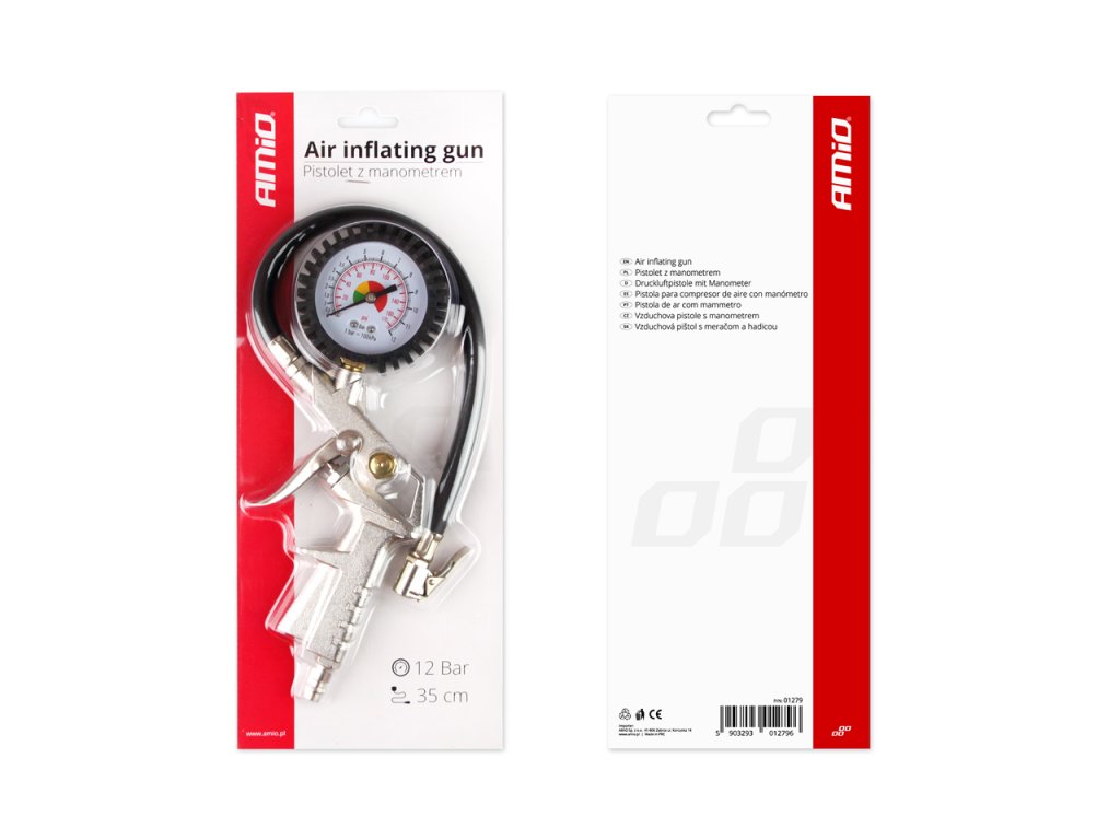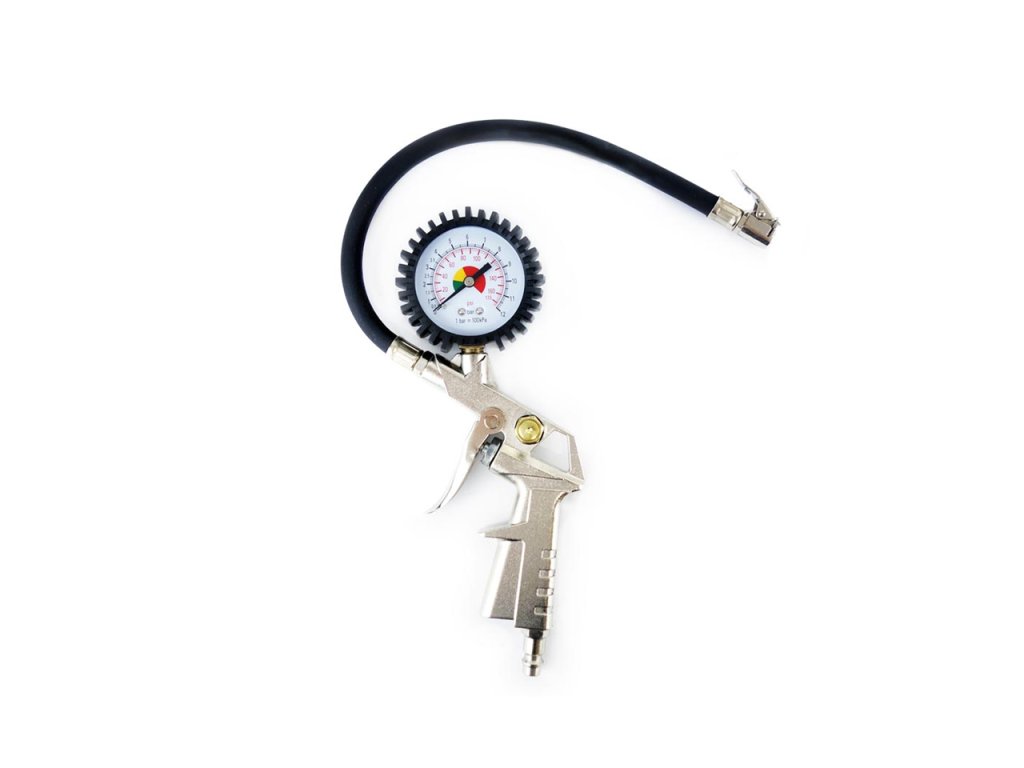 Popis výrobku: Pištoľ sa používa na nafukovanie kolies pomocou štandardných ventilov. Barometer je pokrytý plisovanou gumou, ktorá ho chráni pred poškodením počas neopatrného ukladania. Pištoľ je vybavená štandardným rýchloupínacím konektorom používaným v európskych pneumatických nástrojoch. Okrem toho je pištoľ vybavená odvzdušňovaním. Manometer s farebnou stupnicou 0-12 bar (170 PSI) s ochranným gumovým uzáverom Dĺžka kábla je 35 cmDodatočné parametre