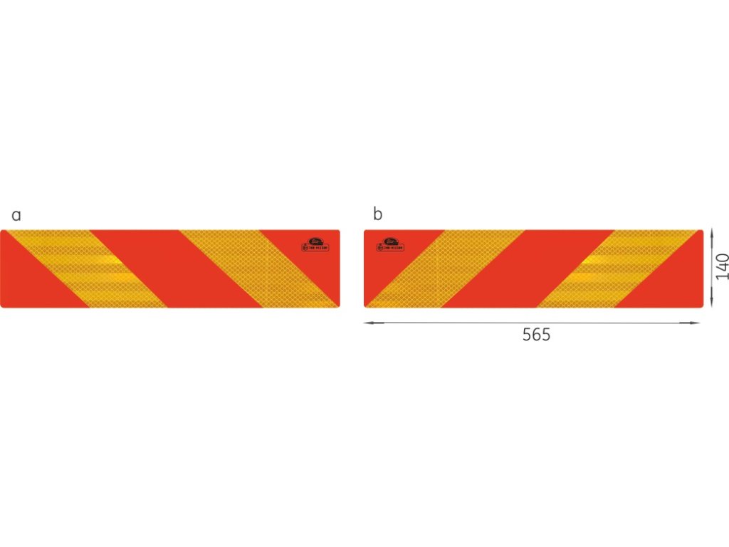 Reflexná tabuľa na vozidlo- pár 70.01 RR - rozmer 565x140 - materiál: podklad-Al plech, červená retroreflexná fólia (nevybledne vplyvom slnečného žiarenia), žltá retroreflexná fólia Class III.Dodatočné parametre
