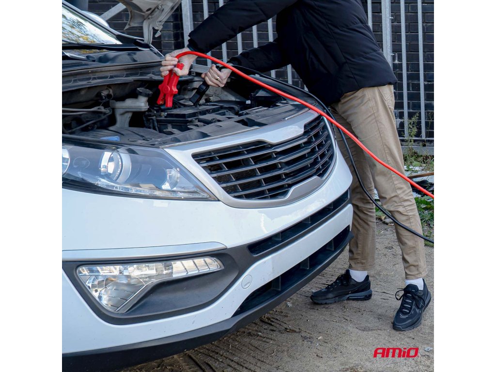Káble sú vyrobené z flexibilného medeného drôtu s prierezom 24,6 mm² a priemerom 10 mm, čo zaisťuje nízky odpor a účinné vedenie prúdu aj pri nízkych teplotách. Robustné, izolované čeľuste so silnými pružinami zabezpečujú spoľahlivý a stabilný kontakt s pólmi batérie.