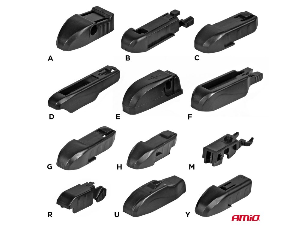 Plochý stierač v balení s 12 rôznymi adaptérmi na uchytenie, pasuje takmer na každý automobil. Kvalitný, grafitov