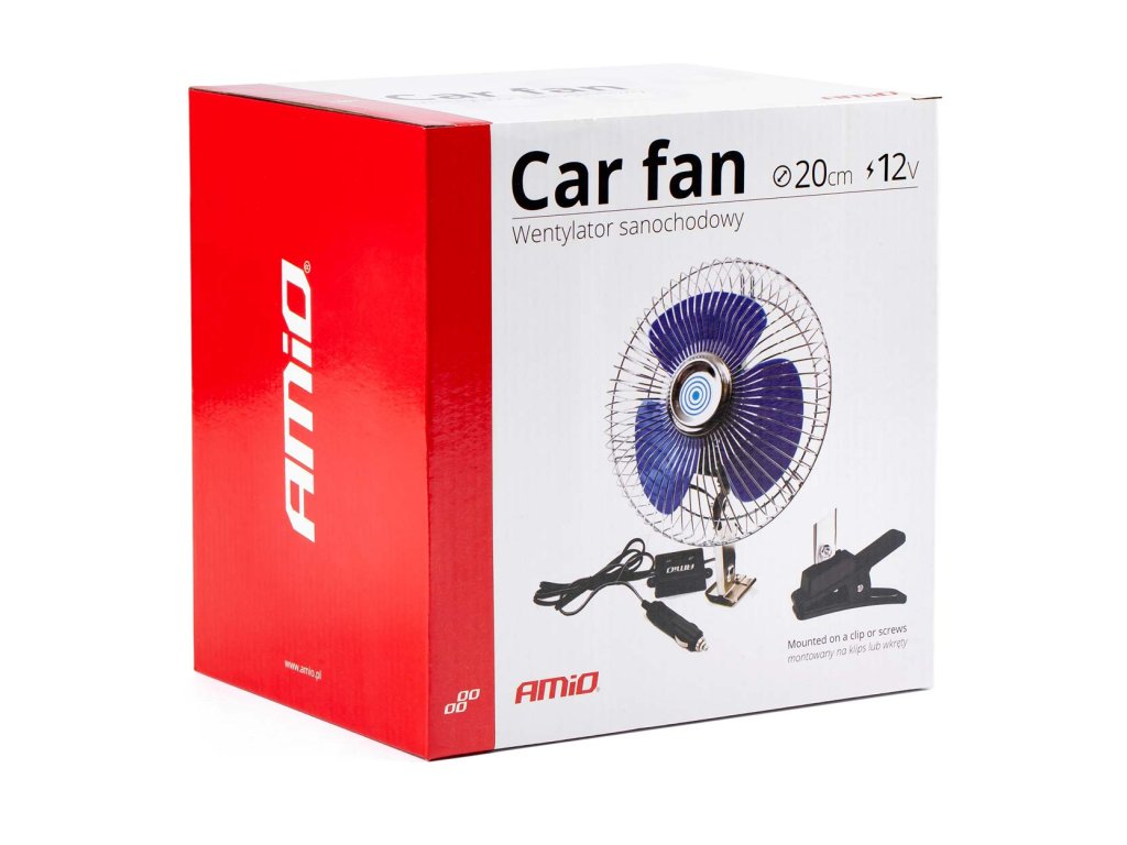 Veľký kovový ventilátor do auta AMiO napájaný z 12 V zapaľovača cigariet. Montáž pomocou spony alebo skrutiek. Funkcie: · Nastavenie uhla sklonu · 2 typy prívodu vzduchu: jednobodové a rotačné · Oscilácia s možnosťou vypnutia Ľahká inštalácia prakticky kdekoľvek vo vozidle (pomocou spony alebo trvalo pomocou skrutiek) · Silné a odolné kovové puzdro Napájanie zo zásuvky zapaľovača cigariet · Zástrčka zapaľovača cigariet má poistku Technické špecifikácie: · Priemer ventilátora: 21 cm Priemer čepele: 17,5 cm · Dĺžka napájacieho kábla: cca 100 cm Napätie: 12V Príkon: 21 W (± 2%) Prepínač oscilácií: áno, na tele ventilátora · Prepínač: áno, na kábli Rozmery spony: 14,5 x 4 x 4 cmDodatočné parametre