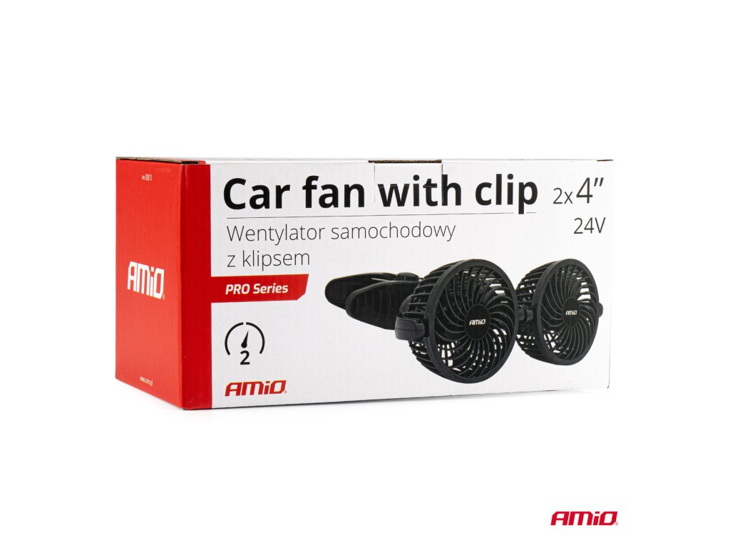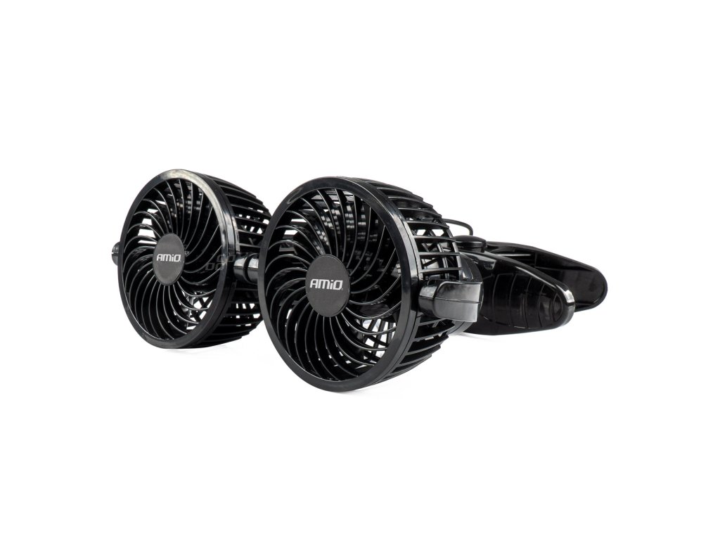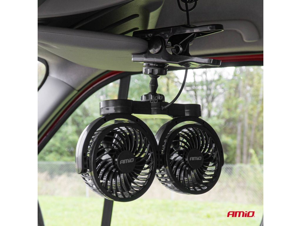 AMiO DVOJITÝ VENTILÁTOR DO AUTA NAPÁJANÝ ZO ZAPAĽOVAČA 12 V A MONTOVANÝ NA SPONU